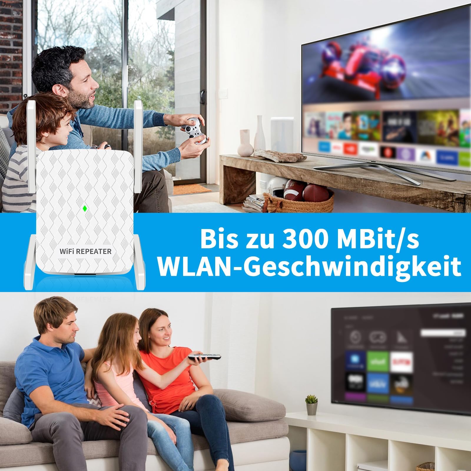 - 𝐔𝐥𝐭𝐫𝐚 𝐇𝐢𝐠𝐡 𝐒𝐩𝐞𝐞𝐝 𝐖𝐋𝐀𝐍 𝐑𝐞𝐩𝐞𝐚𝐭𝐞𝐫: Der WLAN-Verstärker ist mit einem 2.4-GH-Ultra-Core-Prozessor und 4 Hochleistungsantennen mit einer Geschwindigkeit von bis zu 300 Mbit/s ausgestattet. Bietet eine extrem stabile Bandbreite für Online-Spiele, Video-Chats und sogar das Streamen von 4K-HD-Videos. Genießen Sie und Ihre Familie Videos und Spiele zu Hause.