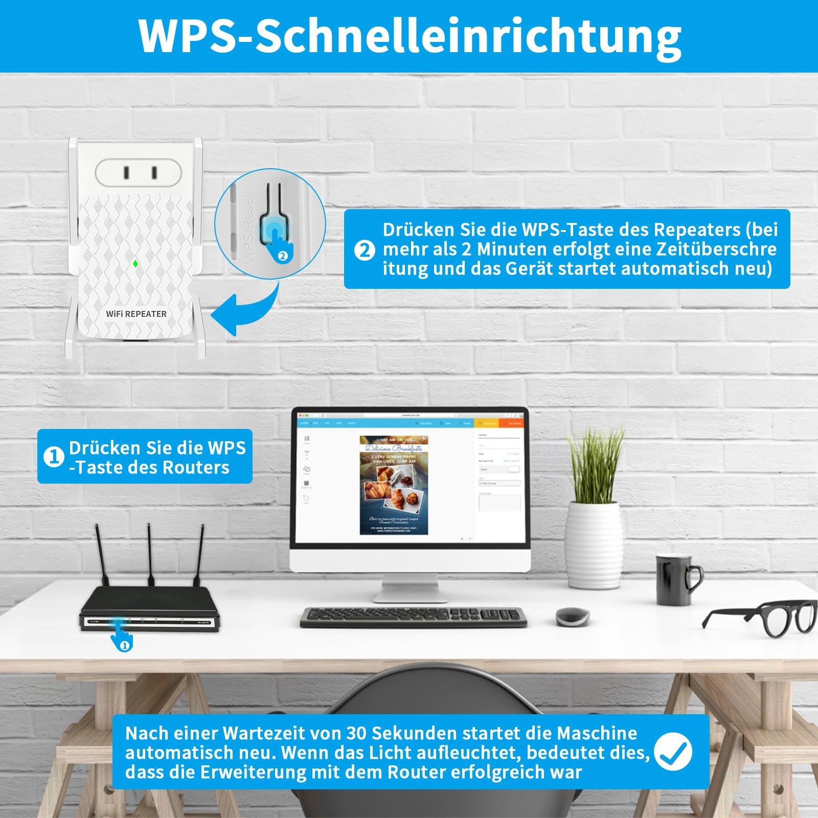- 𝐄𝐢𝐧𝐟𝐚𝐜𝐡𝐞 𝐄𝐢𝐧𝐫𝐢𝐜𝐡𝐭𝐮𝐧𝐠: Schließen Sie den WLAN Repeater einfach an eine beliebige Steckdose an und drücken Sie die WPS-Taste an Ihrem Router, Richten Sie Ihren WiFi-Repeater in nur wenigen Minuten mit einer einfachen Plug-and-Play-Installation ein. Sie können ihn auch über das Netzwerk auf Ihrem Smartphone/Tablet einrichten PC. Sie können die WLAN-Abdeckung ganz einfach und ohne komplizierte Schritte und Tricks erweitern.