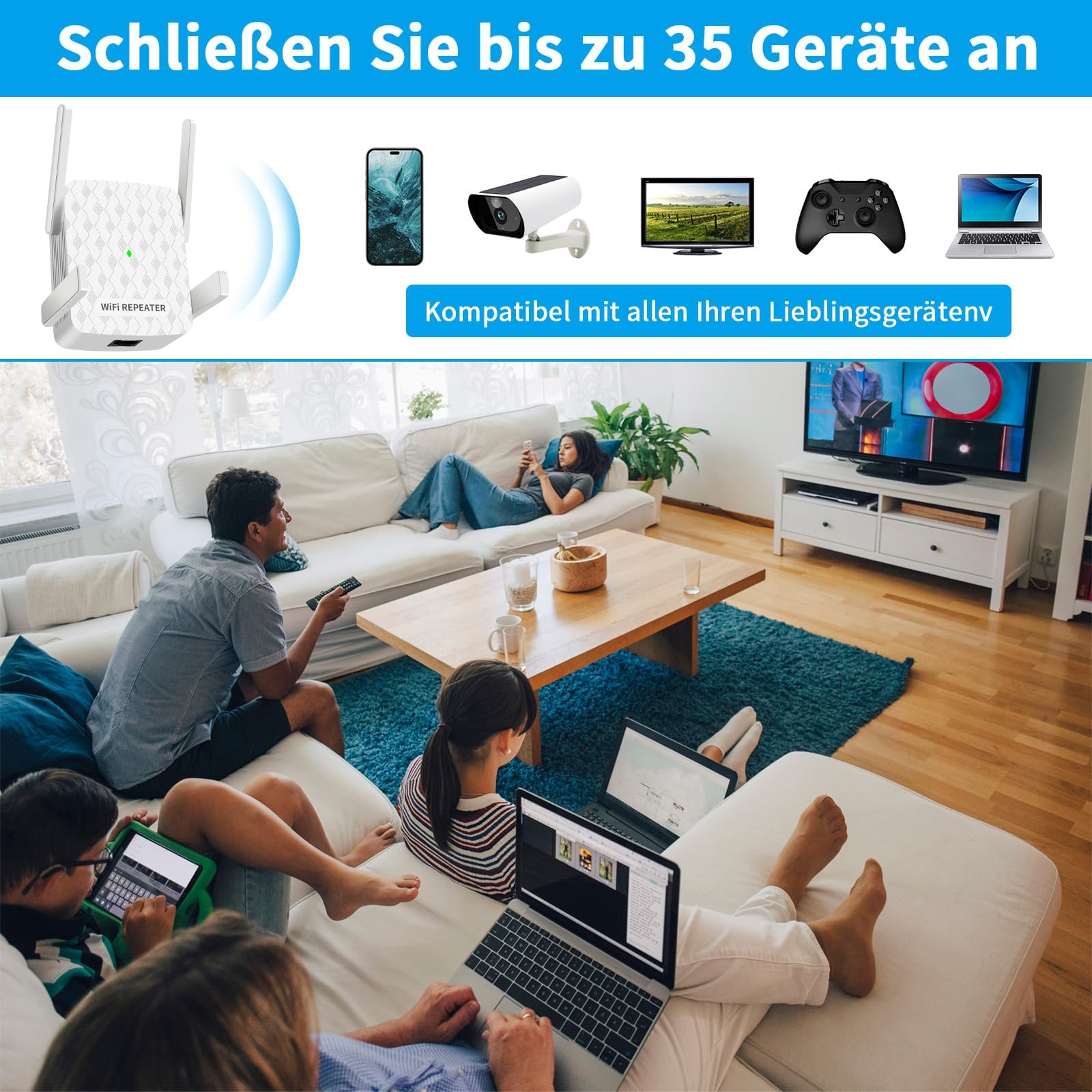- 𝐁𝐫𝐞𝐢𝐭𝐞 𝐀𝐛𝐝𝐞𝐜𝐤𝐮𝐧𝐠: Verabschieden Sie sich von toten Winkeln im WLAN, erweitern Sie Ihre WLAN-Reichweite und verbinden Sie bis zu 35 Geräte. Wie Mobiltelefone, Tablets, Laptops, Smart-TVs, Sicherheitskameras, Alexa usw. Es ermöglicht Ihnen den Empfang stabiler WLAN-Signale in der Garage, auf dem Balkon, im Schlafzimmer und im Garten.