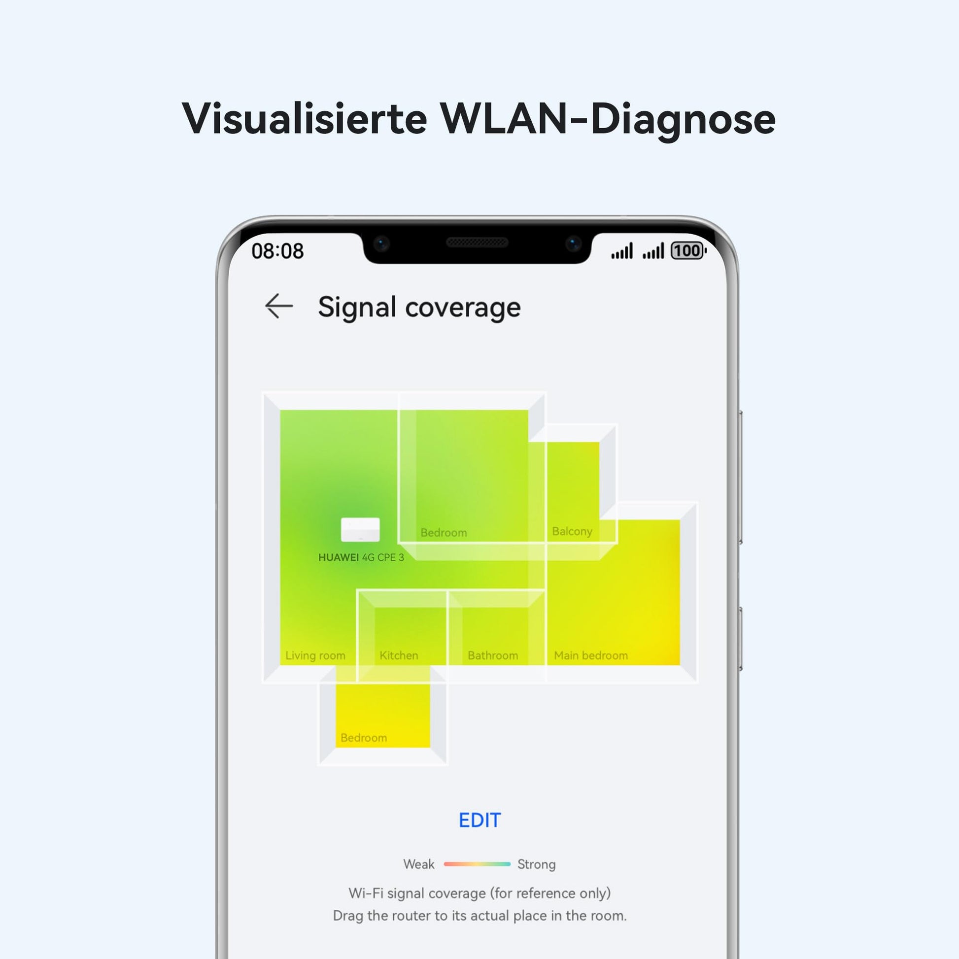 Einzelheiten: Der HUAWEI 4G CPE 3 ist ein drahtloses LTE (Long Term Evolution)-Gateway mit einem Ethernet-LAN/WAN-Anschluss. Damit können mehrere Nutzer zu Hause oder in kleinen Büros mit hoher Geschwindigkeit auf das Internet zugreifen, auch bei langsamer ADSL-, aber guter 4G-Abdeckung. Das Produkt unterstützt LTE KAT. 7 mit bis zu 300 Mbit/s (DL) und 100 Mbit/s (UL), sodass bis zu 32 Geräte gleichzeitig surfen können. Darüber hinaus bietet der HUAWEI 4G CPE 3 eine exklusive visuelle WLAN-Diagnose über die AI Life-App, die es jedem, der keine technischen Vorkenntnisse besitzt, leicht macht, die Installation zu optimieren. (Die angezeigten Daten sind die theoretische Höchstgeschwindigkeit. Die tatsächliche Geschwindigkeit kann je nach Betriebsbedingungen und angeschlossenen Geräten variieren.)(*Die angezeigten Daten sind die theoretische Maximalgeschwindigkeit. Die tatsächliche Geschwindigkeit kann je nach Betriebsbedingungen und angeschlossenen Geräten variieren.)